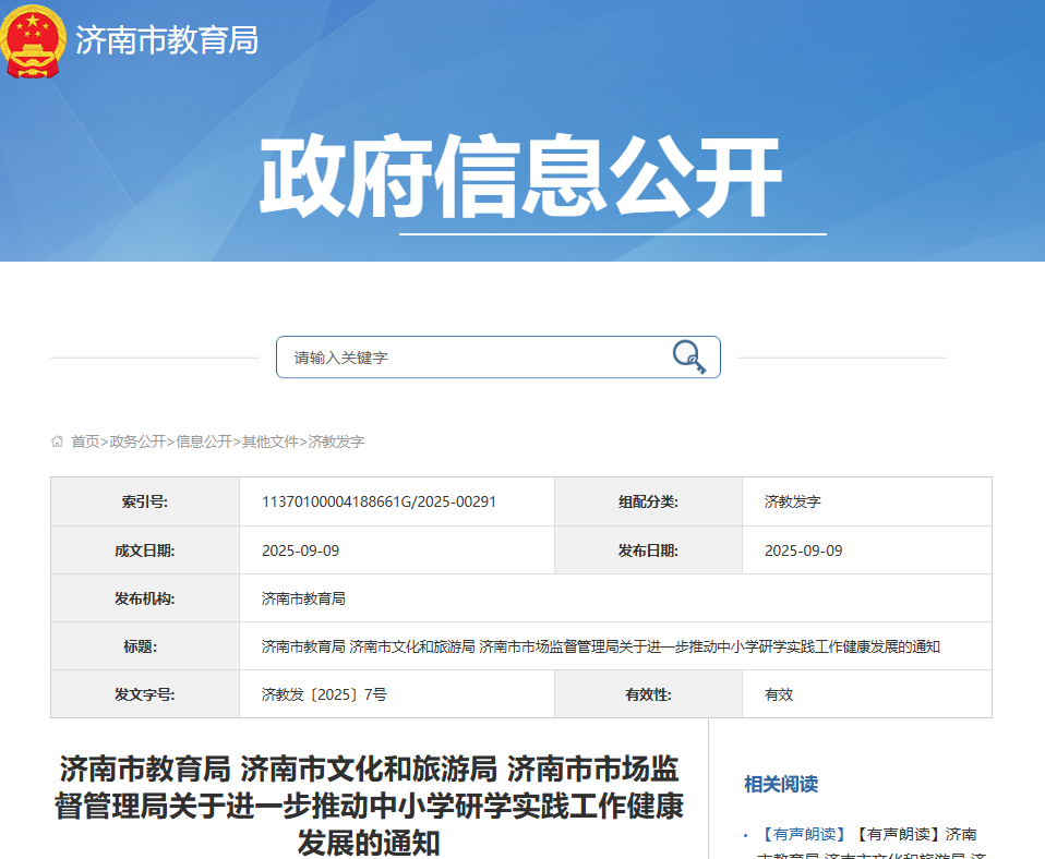 新规标志着研学行业从"野蛮生长"进入"规范发展"新阶段,合规者生存,优质者胜出!让我们紧跟政策,提升专业能力,共同推动研学教育健康发展。 下面同小渝一起看看完整内容。 济南市教育局 济南市文化和旅游局 济南市市场监督管理局关于进一步推动 中小学研学实践工作健康发展的通知 各区县教育和体育局、文化和旅游局、市场监督管理局,直属各中小学校: 为深入贯彻落实全环境立德树人根本任务,规范中小学校研学实践活动,切实提升研学课程质量和育人成效,进一步推动全市中小学研学实践工作健康有序发展,通知如下。 一、工作目标以立德树人为根本目的,教育引导全市中小学生在研学实践活动中亲近自然、开阔眼界、增长学识,感受中华民族传统美德,感受革命光荣历史,感受改革开放伟大成就,培养和提高他们的社会责任感、创新精神和实践能力,使他们在研学实践活动中学会动手动脑、生存生活、做人做事,促进身心健康、体魄强健、意志坚强,促进德智体美劳全面发展。 二、工作要求(一)坚持学校主导。中小学校是研学实践活动组织实施的主体。中小学研学实践教育是由学校有计划地组织安排,通过集体旅行、集中食宿等方式开展的研究性学习与旅行体验相结合的校外教育实践活动,是教育教学的重要组成部分,应纳入中小学教育教学计划安排,与综合实践活动课程统筹考虑,促进与学校课程有机融合。社会机构以“研学”名义自行组织的高校访学、徒步探险、文化感悟、职业体验、冬(夏)令营、支教研学、出国游学等不属于研学实践教育活动。 (二)履行备案审批。中小学研学实践活动一般安排在小学4-6年级、初中1-2年级、高中1-2年级。学校每学年安排集体研学实践活动原则上不超过2次。严格落实备案管理制度,各学校研学方案须在行前至少30日向主管教育行政部门备案。研学实践活动要利用教育教学时间组织开展,原则上不在节假日、周末等非教学时间组织。 (三)确保课程质量。落实《山东省中小学研学实践课程开发指南》,严格把握课程标准。研学课程要全面贯彻党的教育方针,落实立德树人根本任务,坚持教育性、实践性、科学性、创新性原则,满足不同学段学生身心特点、认知能力和思维发展需求。研学资源的选择要符合学生的年龄特点和学习能力,要与课程目标和内容紧密相关,能够帮助学生更好地理解、应用和探索知识,注重教学效果和实用性。 (四)落实安全责任。各学校开展研学实践活动前须制定详实的安全保障措施,针对场所设施、活动项目、食宿交通等做好安全风险评估和安全处置预案,特别注意交通、食宿等安全。学校须投保校方责任险,师生须购买意外险,学校须与研学实践服务机构签订安全责任书,明确安全责任、事故处理、纠纷处置等细节。学校要针对研学实践活动中可能遇到的突发状况,结合安全教育开展应急演练,提高学生自救能力。 (五)完善准入机制。各区县可参照《济南市教育局 济南市发展和改革委员会 济南市文化和旅游局关于印发<济南市市级中小学生研学基地、营地管理办法(试行)>的通知》(济教发〔2023〕21号)对于研学基地的条件要求筛选研学实践服务机构,也可结合本地实际需要制定本区县的研学实践服务机构准入标准。原则上,研学实践服务机构应具备法人资质,持有工商营业执照和旅游主管部门颁发的业务经营许可;服务标准须符合《研学旅游服务要求》(LB/T054-2025);拥有固定办公及经营场所(含独立研学课程设计区域);产权明晰、资产优良,无重大经营风险,按规定投保研学旅行安全责任保险等相关险种;研学实践主题特色鲜明,在本地区、本行业、本领域有一定引领示范作用,具有较强的教育意义;具有完备的研学课程体系,配备专业的研学实践指导教师队伍,课程内容须符合国家课程标准,不得含有危害国家安全、破坏民族团结、宣扬宗教迷信等内容;符合公共场所安全、消防、卫生等要求,安全保障措施完备,有全时段、全方位录像监控系统(录像资料保存60天以上),近3年未发生过安全责任事故、未受到行政处罚,交通、食宿、医疗便利;实行全要素明码标价,收费合理,低于市场价格,通过线上线下渠道公示完整服务内容及对应价格,严禁公示外收费。 (六)加强监督评价。进一步完善评价反馈机制,加强对研学实践服务机构的监督管理。研学实践活动结束后,要及时收集学校、家长和师生反馈意见,作为评价研学实践服务机构的重要依据,以评促建,促进研学实践质量不断提高。建立投诉监督机制,严格落实研学实践活动的监督和管理,各级教育行政部门在官方网站公布研学监督举报电话,联合相关部门及时核查处理学校、家长、师生投诉反映的问题。 三、工作保障(一)加强政策宣传。研学实践活动坚持学生和家长自愿的原则,学校在组织研学实践活动前,要进行充分的政策宣传和组织动员,通过家长会、致家长一封信等方式,清楚明白地告知家长研学实践活动的目的意义、时间安排、出行路线、课程内容、收费明细和注意事项等信息,并与家长签订知情同意书,明确学校、学生、家长的权利和责任。学校不得强制或变相强制学生参加研学实践活动,要妥善安排自愿不参加研学实践活动的学生采取网上研学等方式,为学生提供同等课程学习机会,保障学习效果。 (二)规范程序标准。学校确