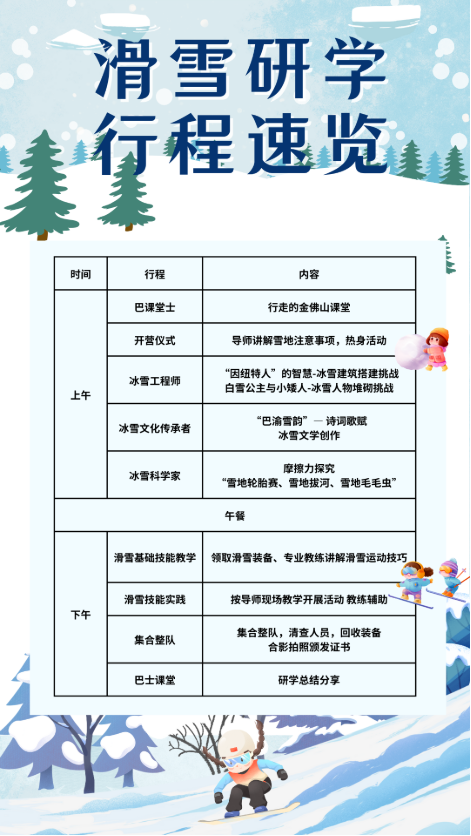 四大特色·全方位成长体验 【冰雪育人·文化赋能】 将冰雪运动与巴渝文化、科学探究深度融合,不止于学习技能,更注重文化熏陶与思维拓展,实现“体教融合”的素质教育目标。 【协作共创,激发潜能】 以小组为单位开展各类雪地挑战,在共同搭建、比赛与创作中培养团队精神、沟通能力与集体荣誉感。 【玩学一体,趣味探索】 将物理知识融入“雪地摩擦力实验”,把文学创作搬进雪原场景,让学生在真实环境中边玩边学,提升综合素质。 【专业守护,安全成长】 配备专业滑雪教练与研学老师,实行小班分组教学,全程守护活动安全,确保每位学生都能在放心环境中挑战自我。 让我们相约,以冰雪为卷,以勇气为笔,在银装素裹的金佛山上,写下属于青春的注脚。 冰雪梦想,不必远行。 成长的勇气,就在此刻点燃。 这个寒假,渝你金佛山见! 研学详细 研学对象: 4-6年级小学生;初高中生 课程时间: 2025年12月20日至2026年2月28日期间的每周六、日(含寒假期间) 联系方式: 13310239127(陈老师) 18683786748(叶老师) 15023917590(许老师) 2025「 金佛山·渝你滑雪季」 欢迎广大高校、家长、机构前来定制研学 渝你研学·与你一起成长 END 编辑|烨子 审核|陈伟 摄影|渝你研学 合作微信|13310239127 联系电话|13310239127 平台官网|cqyanxue.net |