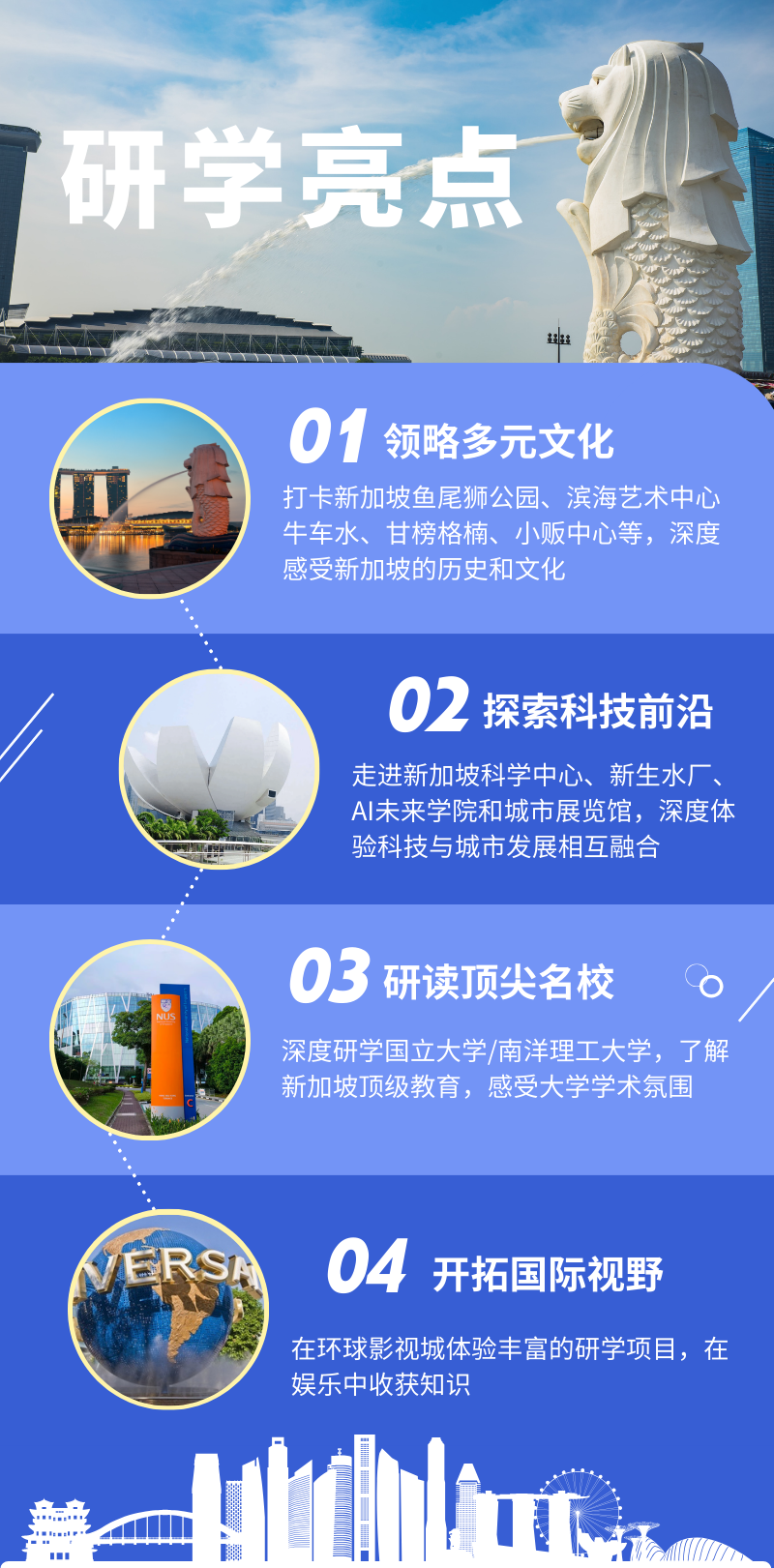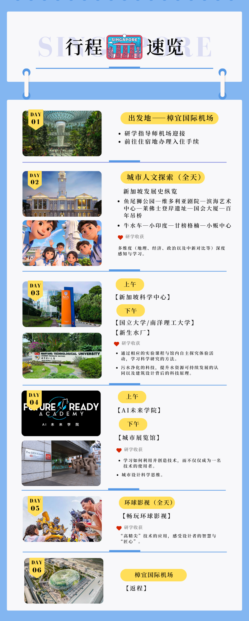 | 重庆研学,渝你研学,与你一起成长! 曾经,书本是孩子们了解世界的窗口,我们在字里行间探寻知识的奥秘。如今,世界变成了孩子们的书本,正等待着我们去触摸、去感知。 新加坡,一个从“星岛”华丽转身成为“亚洲四小龙”的传奇之地。在这片土地上,多元文化交织碰撞,绽放出独特的魅力。从世界级的建筑奇观,到科技之城、金融中心,再到拥有两大顶尖学府的教育之国,新加坡的每一寸土地都蕴藏着丰富的故事与无尽的奥秘。 课程亮点 本次新加坡城市研学营,孩子们将不仅仅是知识的接受者,更是探索者、实践者。他们将从人文、历史、教育、科技等多维度深入融入,全方位、深入地感受新加坡这座多彩城市的魅力! 新加坡,以其丰富多元的文化而著称。与云南的“多民族融合”不同,新加坡的文化更多源于国际间的交流与碰撞。因此,对于同学们来说,需站在国际的视角去深入探索和审视新加坡的文化特色与共存之道。 同学们将探访鱼尾狮公园,感受海洋文化与城市活力;参观维多利亚剧院,深入了解文化传统与艺术魅力;漫步滨海艺术中心,感受现代建筑设计与文化艺术的完美融合。 走进新加坡古老的街区牛车水、小印度、甘榜格南、小贩中心等,探寻那些交织着现代与历史的身影。品味地道的特色美食,感受新加坡的创意与活力,领略不同文化的独特魅力。 启发下一代牛顿或爱因斯坦的理想之地 拥有14个展馆,超过1000件互动展品,涵盖了物理、化学、生物、地理等多个科学领域,通过互动展品和实验装置,让同学们在亲身体验中感受到科学的趣味和实用性。 从“了解你的便便”展览中,可以窥见生理学的奥秘;在“地球”展区,深入了解地震海啸火山喷发气候变化这些现象的科学原理和影响;而在“镜子迷宫体验展”中,仿佛置身于一个充满奇幻与惊喜的魔法世界。 新加坡是一个水资源极为匮乏的国家,其国内水资源总量相对较少,人均水资源更是居世界倒数第二。长期以来,新加坡不得不依赖进口水资源来满足其日益增长的用水需求。然而,这种外部依赖带来了高昂的经济成本,因此,新生水厂应运而生。 同学们将有机会深入了解新生水厂的生产流程和技术,亲眼见证污水是如何通过一系列复杂的处理过程,转化为高质量的可再生水资源的。在这个过程中,将学习到关于水处理、水资源循环利用等方面的知识,增强对水资源的认识和保护意识。 通过探索创作沉浸式科学体验,了解增强现实及虚拟现实技术,在课程中,处处会运用到STEAM教育模式的精神,培养同学们批判性思维及解决问题的能力,准备成为21世纪中的创新者。 一座城市的生命,往往源自其独特的规划理念。新加坡作为一个“岛国”,虽资源有限,却凭借卓越的城市规划,成功跻身世界一线城市之列,融合了多元国家特色文化,展现出别样的都市风采。 走进新加坡城市展览馆,从土地使用规划、交通网络设计、环境保护和社区发展等角度,深入探究新加坡如何从“星洲”一跃成为“亚洲四小龙”。 新加坡的教育体系被公认为是全球最为先进和成功的之一,其独特的教育理念和制度设计使得新加坡在教育领域取得了显著的成就。 因其多民族的特殊国情,对不同文化的包容度也更高,这也使得其课程设置十分灵活,更加注重对学生个人能力的培养。而其教育制度不仅吸取了西方教育系统的长处——兴趣导向和批判性思维,又保留了我们东方传统的优点——扎实基础和学科深度,因此也被誉为“亚洲最适合儿童成长的国家”。 此次研学,我们将走进世界顶尖学府——新加坡国立大学或南洋理工大学,体验不同的环境优势带来的教育资源与发展机会。 了解当地教育制度,体验不同风俗文化,认识国家/地区发展水平。与名校导师和学长学姐深度交流,增强人文交流,开拓国际视野。 新加坡国立大学是新加坡首屈一指的世界级顶尖大学,为 AACSB 和 EQUIS 认证成员,亚洲大学联盟、亚太国际教育协会、国际研究型大学联盟、环太平洋大学协会成员。2024 年 QS 世界排名第 8,连续五年在亚洲排名第 1。 南洋理工大学是新加坡的一所世界级综合研究型大学,是进入世界主流大学排名TOP15 的亚洲大学之一。 其商学院连续三年在英国《金融时报》全球 MBA 排名上升,2024 年南洋理工大学 QS 世界大学排名第 26 名。 体验刺激与欢乐 畅玩七个主题区:古埃及、失落的世界、好莱坞大道等,同学们可以在这里体验电影中的经典场景,深入了解电影制作的奥秘;乘坐双轨过山车,在高速飞驰中感受刺激与快感。将在这里收获知识、感受刺激,度过一个充满乐趣与惊喜的研学之旅。 研学行程中将品尝特色娘惹餐、马来特色糕点/餐食、印度特色餐、闽南地区地道风味餐食等。 参加本次研学活动将收获一份研学证书 四年级及以上学生 2026年寒假期间(具体的营期日期将于寒假前两至三周公布) 13310239127 18683786748 15023917590 扫描二维码 咨询更多详情 2025「 城市研学·新加坡」 欢迎广大高校、家长、机构前来定制研学 部分图来源网络,侵删 渝你研学·与你一起成长 END 编辑|烨子 审核|陈伟 摄影|渝你研学 合作微信|13310239127 联系电话|13310239127 平台官网|cqyanxue.net |