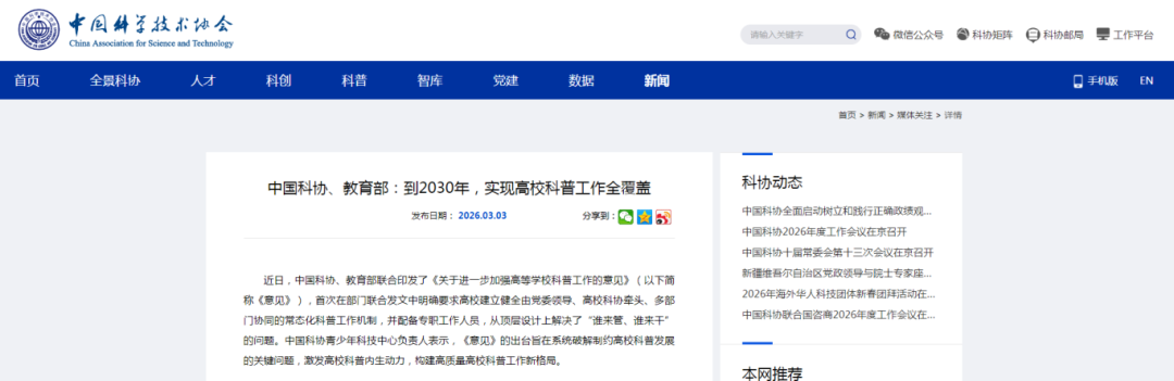 | 重庆研学,渝你研学,与你一起成长! 为激发高校科普内生动力,推动高校科普工作高质量发展,中国科协、教育部日前印发《关于进一步加强高等学校科普工作的意见》,提出到2030年实现高校科普工作全覆盖。 跟小渝一起看看详细内容: 根据意见,到2030年,高校科普工作体系将更加完善,高校科普地位作用更加凸显,科学素质和能力培养导向更加鲜明,高校社会化科普服务效能更加彰显,服务国家创新驱动发展的贡献度进一步提升。 中国科协青少年科技中心负责人表示,这一目标旨在推动高校科普从“有没有”向“优不优”转变,使其真正成为国家科普体系的重要力量。 意见提出四大重点任务,包括大力组织开展面向大学生的科普工作、大力组织开展面向公众的社会科普活动、着力提升高校科普服务能力和加强科普工作保障体系建设。同时,遵循分类指导、精准施策的原则,对高校内外两类群体作出了清晰的功能定位和路径设计。 着眼于构建长效机制,意见在关键机制上实现了突破和创新。比如,意见强化了考核评价与激励机制,明确提出,高校应将科技人员和教师的科普工作、科普成果纳入业绩考核范畴;将指导学生科普实践、参与中小学科学教育工作纳入教学工作量;学生科普活动认定相应社会实践学分或科普学分,科普志愿服务时间计入志愿服务时长等。 在加强科普社会化协同合作方面,意见提出,高校应加大与各级科协、学会、科普场馆、企业等的深度合作,共建馆校科普实验室,促进科研成果科普化首台(套)展品开发及科普资源共建共享。 文章来源:新华社。其版权归原作者所有,我们的初衷和目的是为了更多研学人学习进步,共同推动研学旅行行业高质量发展。如有侵权,请联系我们删除! |