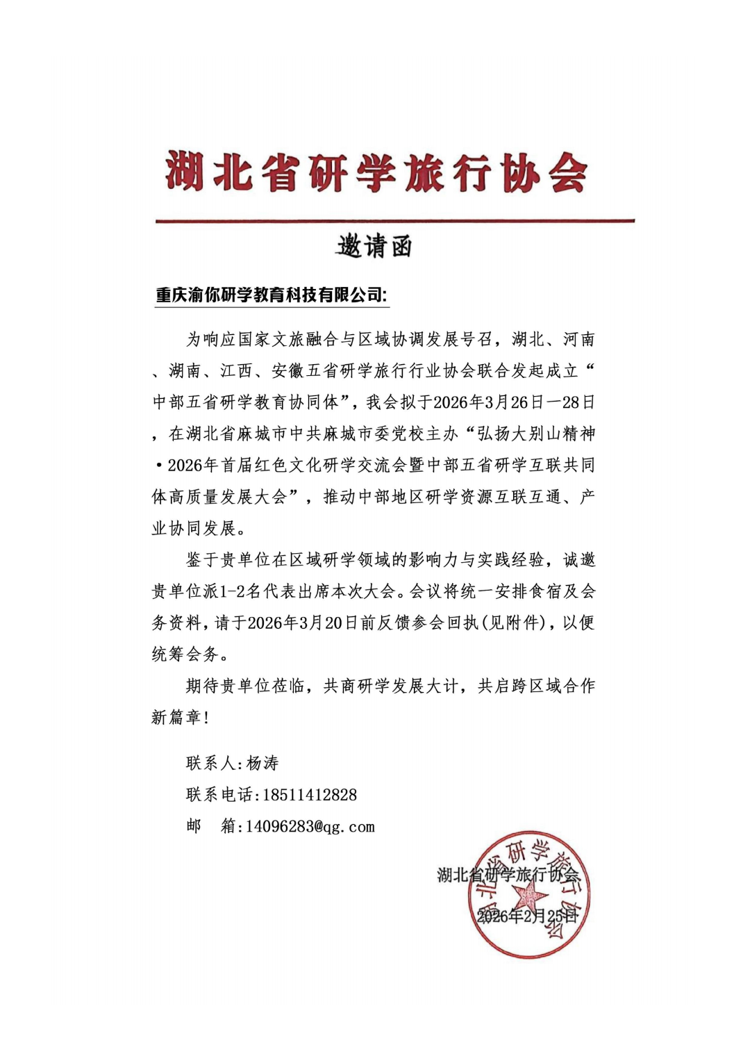 | 重庆研学,渝你研学,与你一起成长! 在研学旅行行业蓬勃发展却又面临转型升级的关键时期,渝你研学荣幸受邀参加“弘扬大别山精神2026年首届红色文化研学交流会暨中部五省研学互联共同体高质量发展大会”。 此次大会汇聚了全国研学领域的精英与智慧,渝你研学将借此平台,与业界同仁共探红色研学新发展,探索跨区域研学合作新模式。 01会议举办背景 本次大会积极响应习近平总书记关于“大力弘扬大别山精神、抗洪精神、抗疫精神,广泛践行社会主义核心价值观”的重要指示,旨在深度挖掘大别山精神的时代价值,推动红色研学旅行的高质量发展。 在当前研学旅行市场竞争加剧、资源流通不畅的背景下,大会的召开无疑为行业注入了一剂强心针,为渝你研学等研学机构提供了宝贵的交流与合作机会。 02会议组织机构与参会人员 大会由湖北省研学旅行协会主导发起,麻城市人民政府指导,联合中部五省(湖北、河南、安徽、江西、湖南)的研学旅行协会共同主办,阵容强大。 参会人员涵盖全国教育系统相关负责人、高校及职业院校师生、青少年宫及少年儿童活动中心负责人、研学实践基(营)地代表、旅行社及行业协会特邀代表等,形成了研学旅行行业的全方位交流网络。 03会议亮点与核心议题 中部五省优势资源共享联动 大会突破地域限制,推动中部五省研学教育文旅资源的深度整合与协同发展。渝你研学将借此契机,与五省同行建立紧密联系,共同开发跨区域研学课程,实现资源共享与产业互补,为学生提供更加丰富多元的研学体验。 跨区域研学模式创新应用 针对当前研学旅行行业“内卷化”竞争加剧的问题,大会提出“互联互通、协同发展”的解决方案。渝你研学将积极参与跨区域研学服务的优化讨论,探索通过政策协同、市场运作、技术创新等手段打通行业壁垒,推动研学实践教育的可持续发展。 全国首次创新众筹办会模式 大会采用政府搭台、企业路演的众筹办会模式,为参会者提供务实交流、资源共享的高端平台。渝你研学将展示自身研学课程与特色项目,与同行进行深度互动,汲取行业智慧,共同提升研学课程质量与市场竞争力。 全国省/市研学生源单位洽谈签约 大会安排了全国省、市层面的研学机构代表进行生源洽谈签约环节。渝你研学将积极参与,通过行政引导与市场机制相结合的方式,构建高效、信任、共赢的供需对接机制,降低沟通成本与风险成本,拓展市场份额。 04会议内容 大会将通过主旨报告、专题讲座、实践案例分享及研学人对话等多种形式展开深入交流。 作为研学旅行行业的积极参与者,渝你研学对此次大会充满期待。我们相信,通过大会的交流与学习,渝你研学将能够进一步提升自身专业素养与研学课程质量,为红色研学旅行的发展贡献更多智慧与力量。 同时,我们也期待与中部五省的同行建立长期稳定的合作关系,共同推动研学旅行行业的健康可持续发展。 渝你研学·与你一起成长 END 编辑|小渝 审核|陈伟 摄影|渝你研学 合作微信|13310239127 联系电话|13310239127 平台官网|cqyanxue.net |